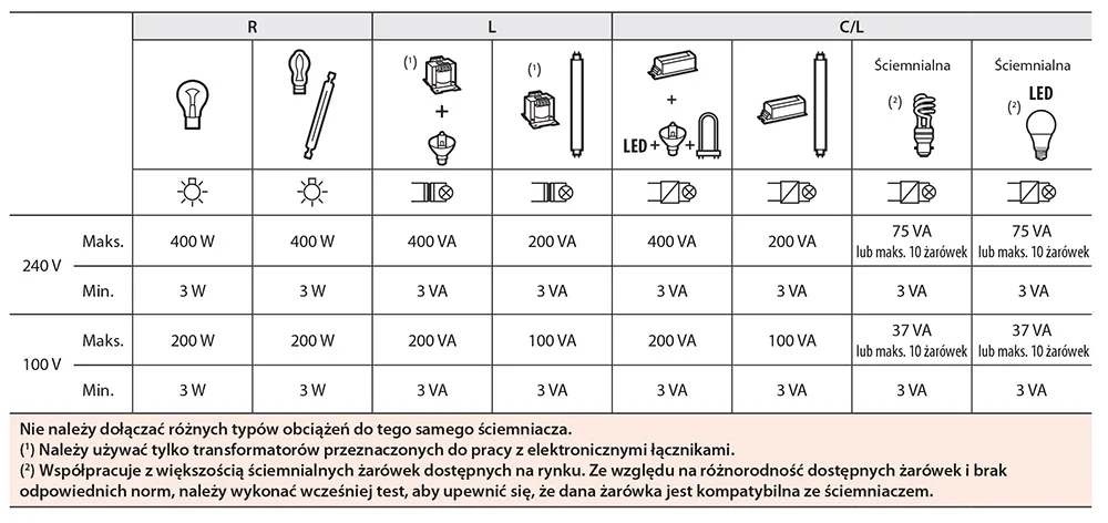 | Model ściemniacza | Typ źródła światła | Maksymalne obciążenie | Kompatybilność |